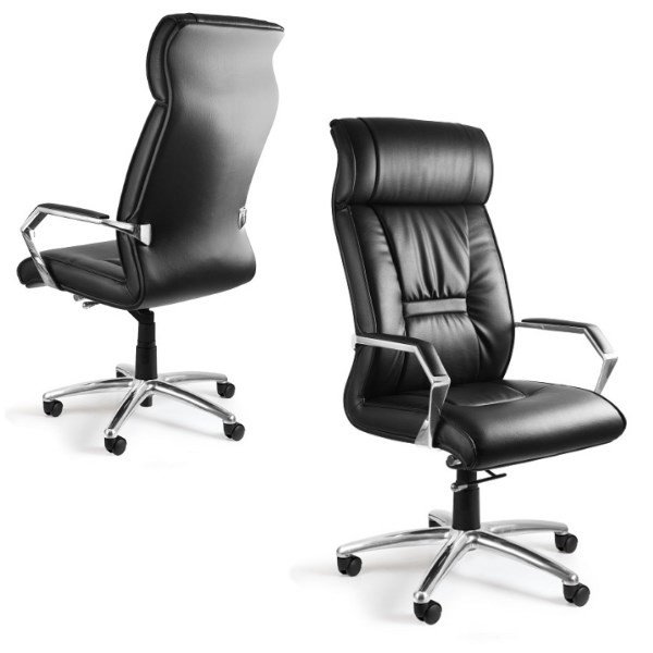 drahšia varianta kresla Orlando, s tvarovanými podrúčkami lomenými pod uhlom a širším sedákom, dostupná v prevedení čierna koženka alebo čierna koža. Kreslo vhodné ako elegantný doplnok do kancelárie.